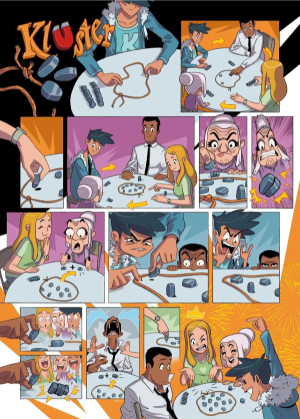 Žaidėjai vienas po kito deda magnetukus ant stalo (zona apribota virvele). Jei kuriam magnetai sulimpa - jis juos turi pasiimti. Žaidėjas pirmas nebeturintis akmenukų - laimi. Visos taisyklės gražiai atvaizduotos iliustracijoje apačioje.